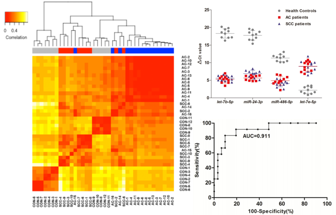 簡(jiǎn)介:本文發(fā)現(xiàn)腺癌(AC)和鱗癌(SCC)患者的血漿可分離出腫瘤來(lái)源外泌體,其中外泌體miRNA極有希望用于NSCLC早期預(yù)測(cè)和診斷。文章利用miRNA-seq對(duì)46個(gè)I期NSCLC患者和42個(gè)健康個(gè)體的外泌體進(jìn)行miRNA分析,以鑒定和驗(yàn)證AC和SCC的特異性表達(dá)miRNA。結(jié)果表明,miR-181-5P、miR-30a-3p、miR-30e-3p和miR-361-5p為AC特異性的;miR-10b-5p、miR-15b-5p和miR-320b為SCC特異性的。后續(xù)繪制ROC曲線預(yù)測(cè)評(píng)估三種組合miRNA疾病相關(guān)性。事實(shí)證明這些miRNA有極大潛力成為NSCLC早期診斷生物標(biāo)志物。